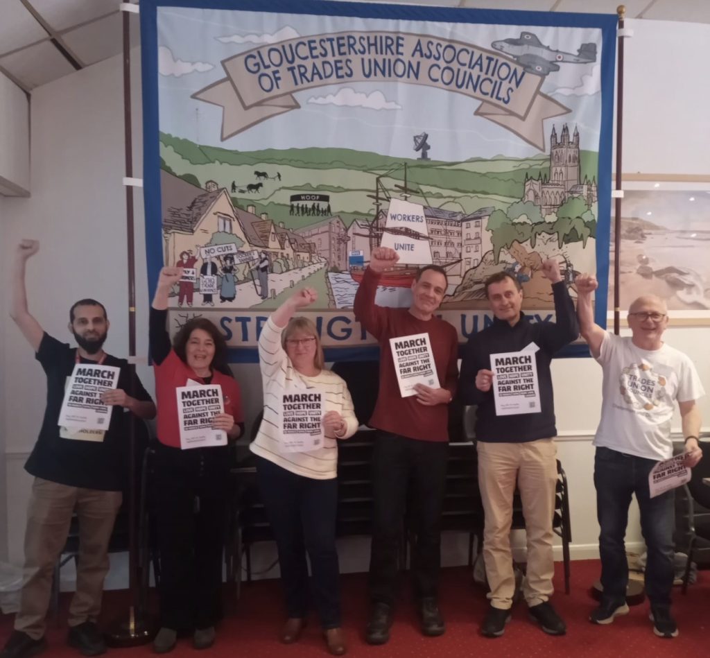 Stroud delegates recently attended the South West TUC AGM and this picture shows our delegates along with others from the county in front of the new Gloucestershire Association of Trades Union Councils banner.